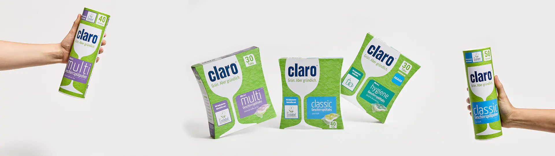 Die wasserlösliche Folie besteht aus sogenannten Polymeren. Das besondere an diesen Polymeren ist, dass diese vollständig biologisch abbaubar sind. Die Polymere der wasserlöslichen Folie werden zu Kohlenstoffdioxid (Co²) und Wasser (H2O) abgebaut. Wenn sie sich also im Wasser auflösen, bleibt nichts zurück – weder im Wasser, noch in der Spülmaschine und schon gar nicht auf dem Geschirr. Durch die patentierte wasserlösliche Folie der Tabs reduzieren wir bei claro Plastikabfall.
