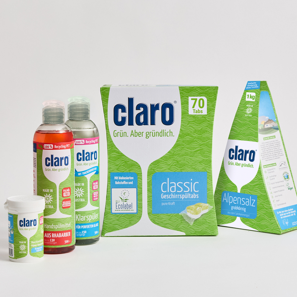 Sauber durchstarten mit dem großen Classic Paket. claro Classic Geschirrspültabs, Alpensalz und Klarspüler für perfekte Reinigungsleistung. Maschinenpfleger für eine hygienische Spülmaschine und Rhabarber Handgeschirrspülmittel für alles, was nicht in die Spülmaschine passt.