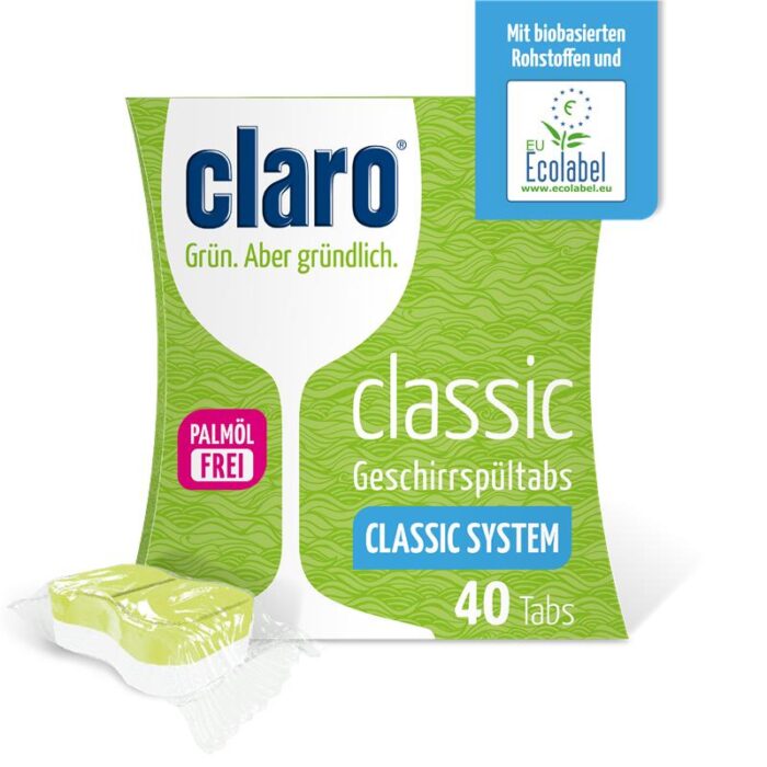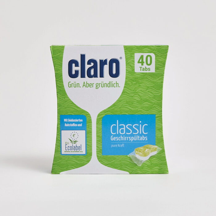 The Tabs are designed so they dissolve layer by layer. Certain enzymes and cleaning agents firstly remove the tough dirt and the remaining substances deploy their cleaning power one after another. With the claro Classic Tabs we planned the sequence carefully to get the best results. Like every good eco-dishwashing product, our Classic Tabs have never seen chlorine or phosphate. On top of that, every single tab is wrapped in our practical water-soluble film ready for its big performance.