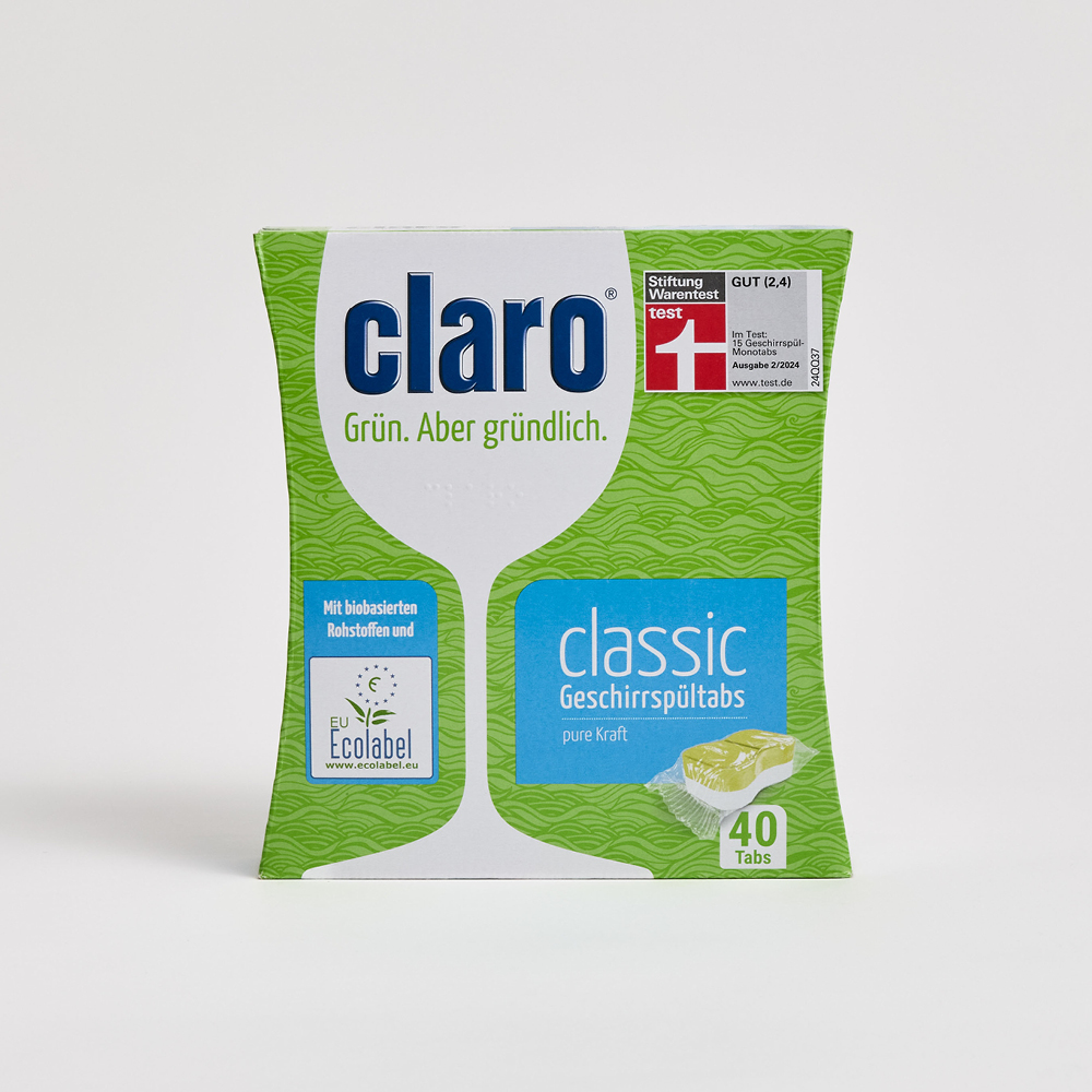 The Tabs are designed so they dissolve layer by layer. Certain enzymes and cleaning agents firstly remove the tough dirt and the remaining substances deploy their cleaning power one after another. With the claro Classic Tabs we planned the sequence carefully to get the best results. Like every good eco-dishwashing product, our Classic Tabs have never seen chlorine or phosphate. On top of that, every single tab is wrapped in our practical water-soluble film ready for its big performance.